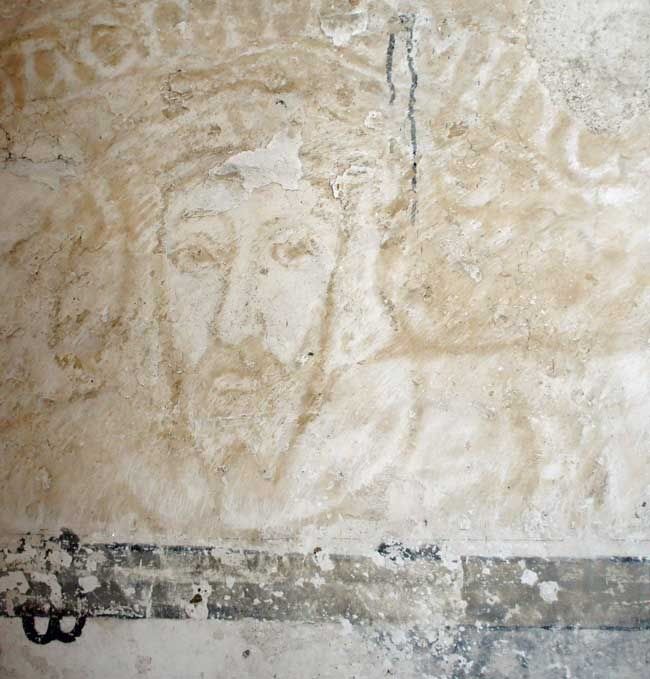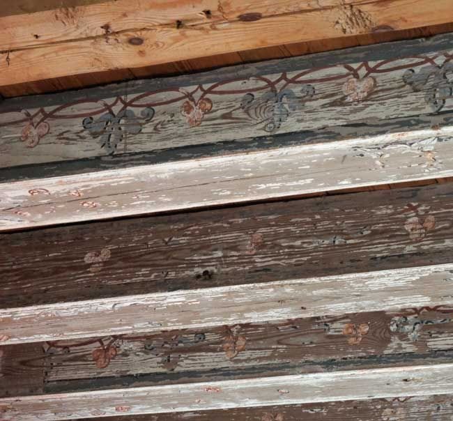 Yksityiskohta salin kattoparrujen alkuperäisistä koristemaalauksista.