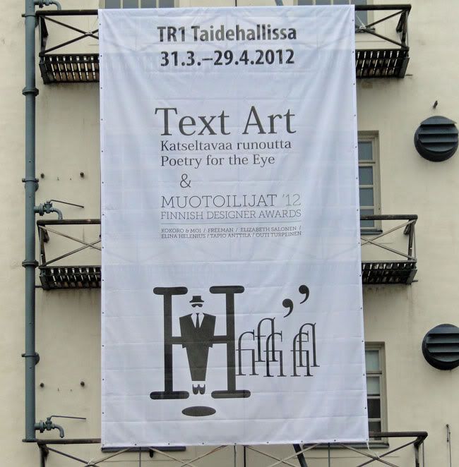 Kulutimme tovin Tampereen TR1 Taidehallissa, jossa oli esillä visuaalisen runouden näyttely Text Art. Visuaalinen runous on näemmä leikittelyä sanoilla, kirjaimilla, kirjasinlajeilla ja tekstikatkelmilla. Sanomattakin selvää, että siitä ei voinut olla viehättymättä.